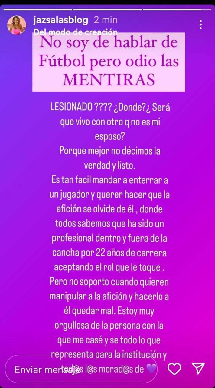 Seguramente, tras escuchar esa justificación, Salas explotó con un mensaje que compartió en sus historias de la red social Instagram y pidió que por favor digan la verdad.
