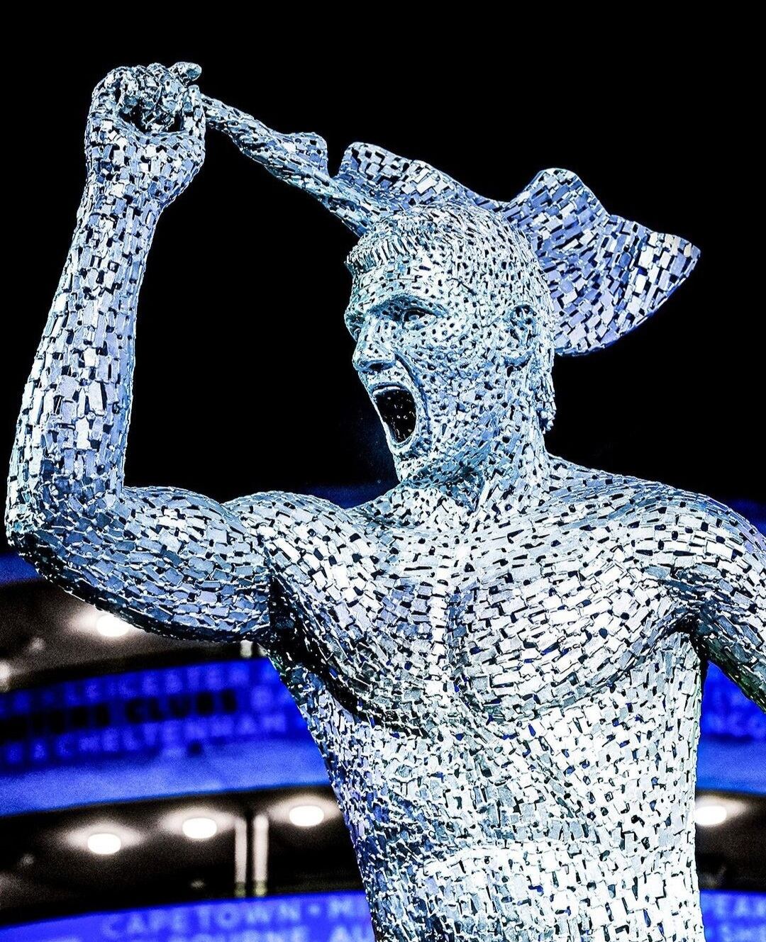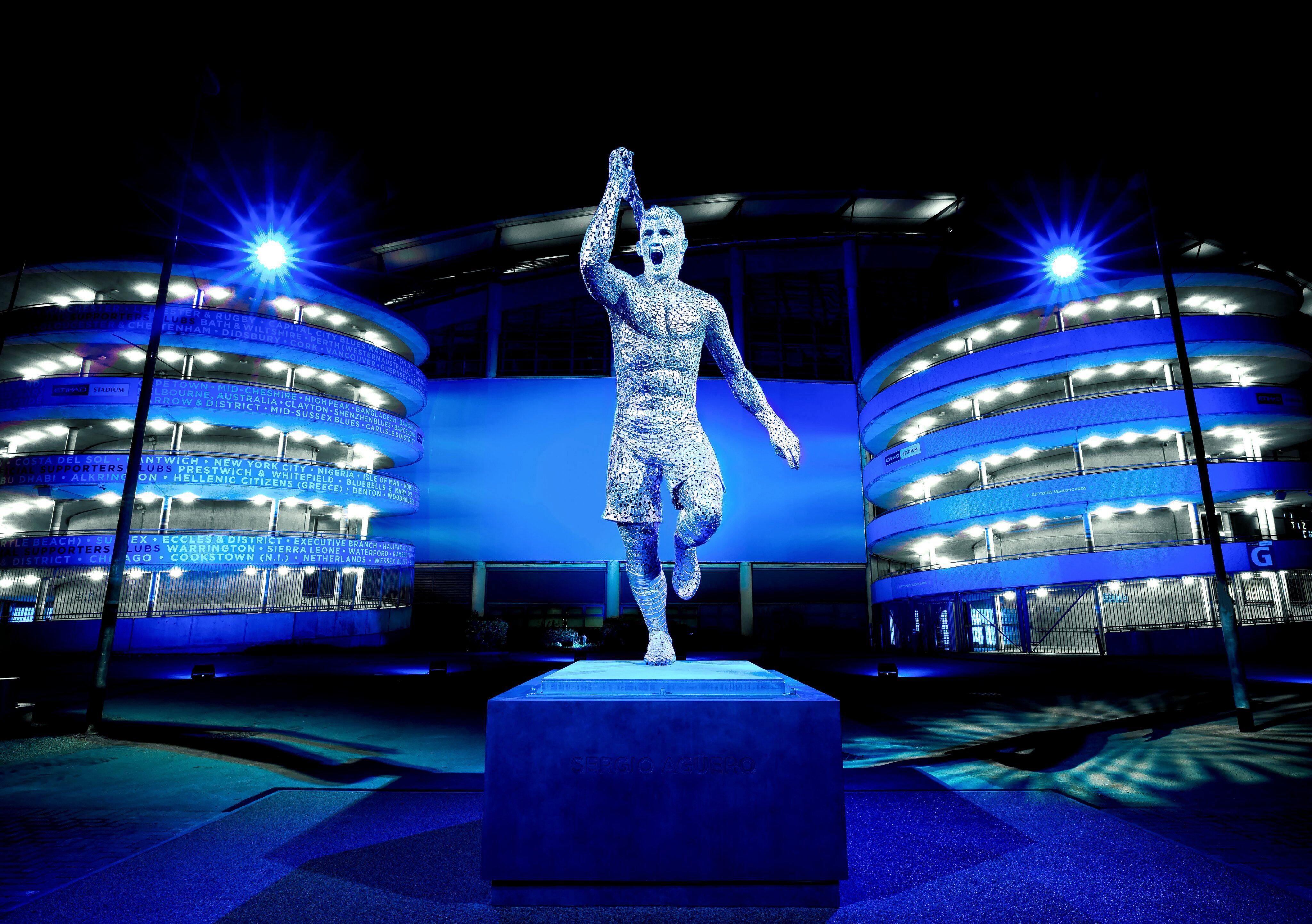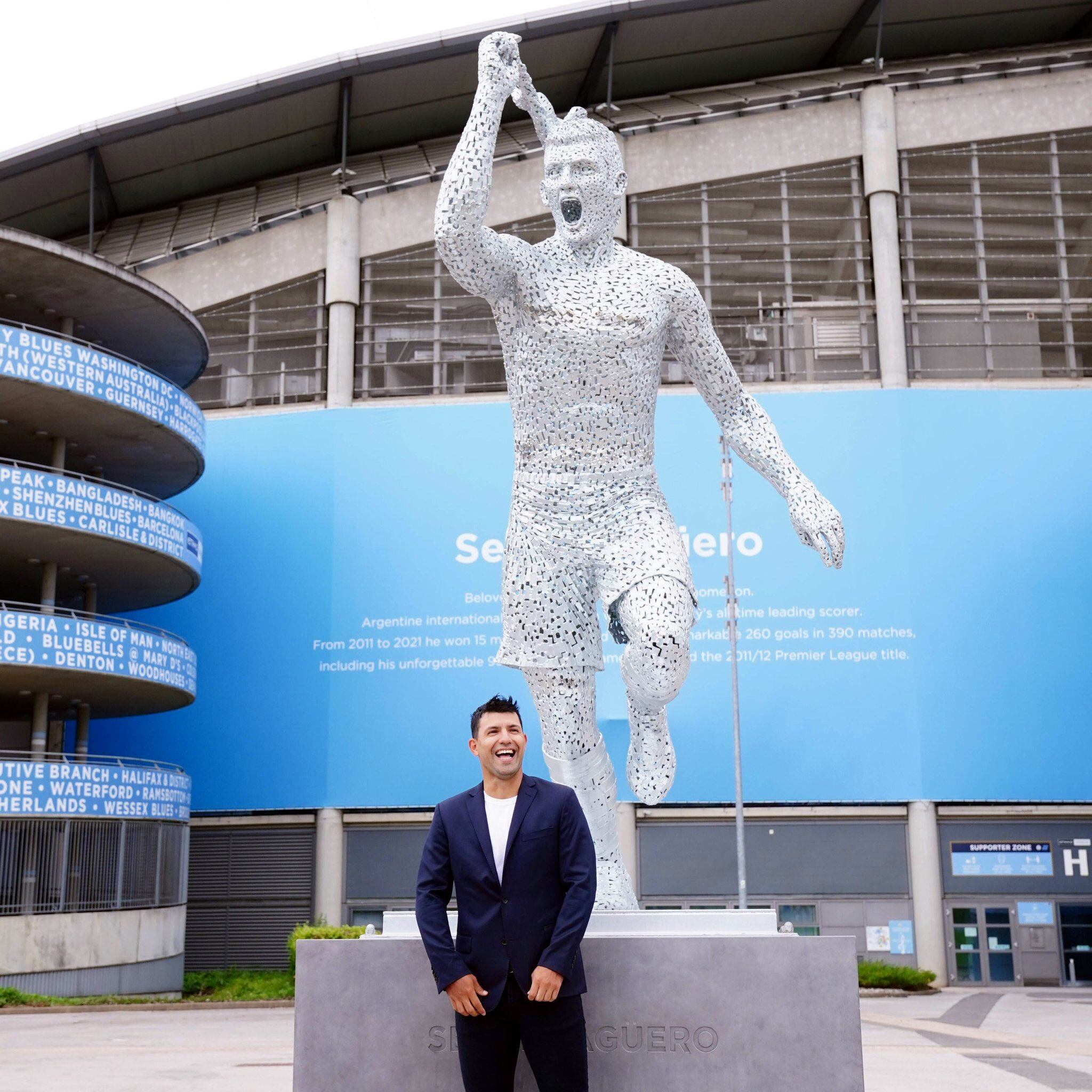 La estatua, instalada en la entrada del Etihad Stadium y realizada por el escultor Andy Scott, está formada por miles de piezas soldadas de acero galvanizado y representa al delantero argentino sin camisa y la chema en la mano celebrando aquel histórico gol.