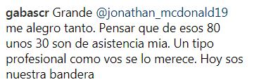 "Gracias a él (López) y a Miso que me exigen todos los días que me retan todos los días a dar siempre un poco más que me dan consejos diarios y me corrigen! Como no estar agradecido con la vida que Dios me a dado teniendo a mis ídolos como entrenadores este semestre", expresó.