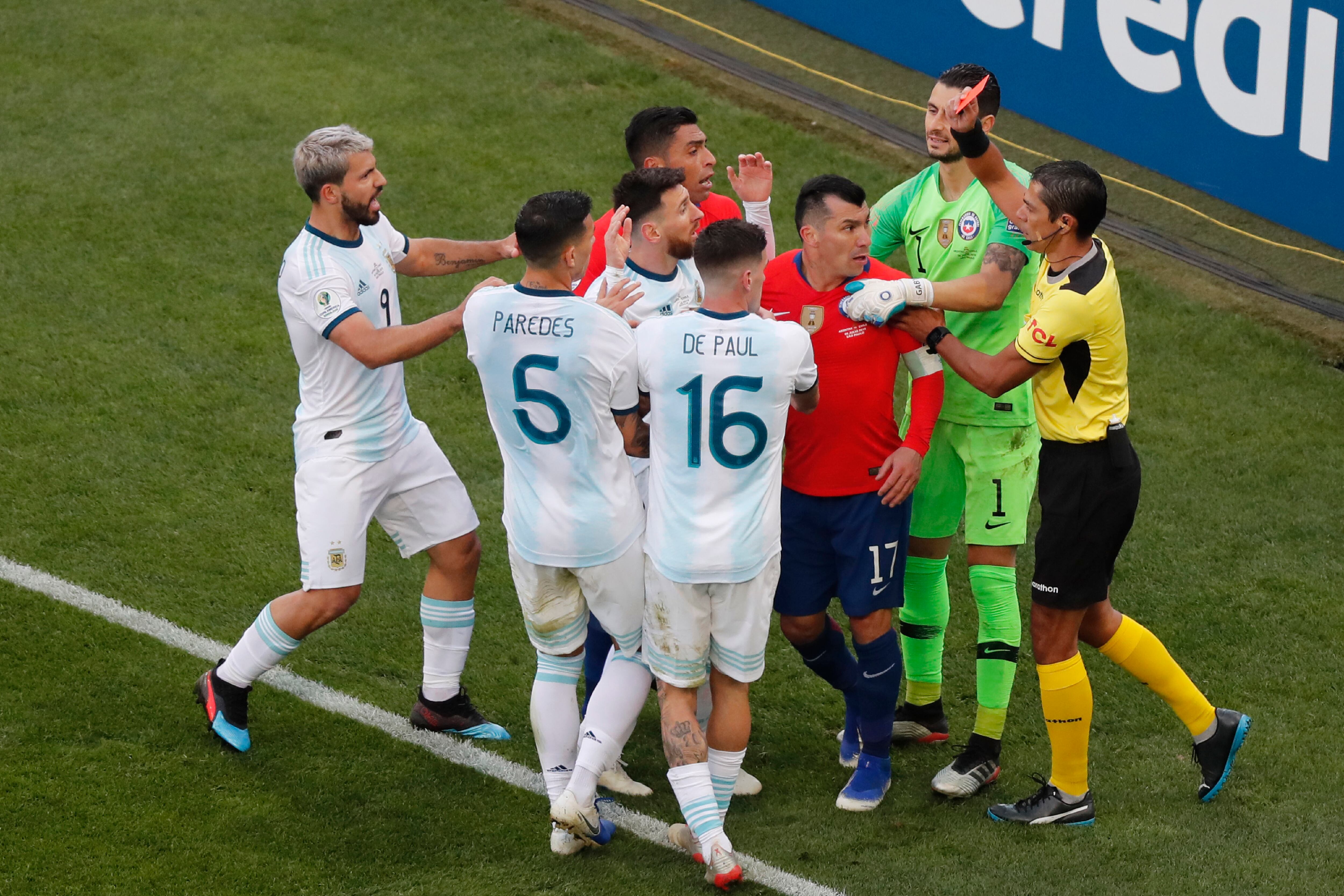 Argentina jugó bien este sábado y derrotó 2-1 a Chile en el partido por el tercer puesto de la Copa América, pero su astro Lionel Messi no jugó completo el primer tiempo porque salió expulsado tras un encontronazo con el chileno Gary Medel, que también vio la tarjeta roja.