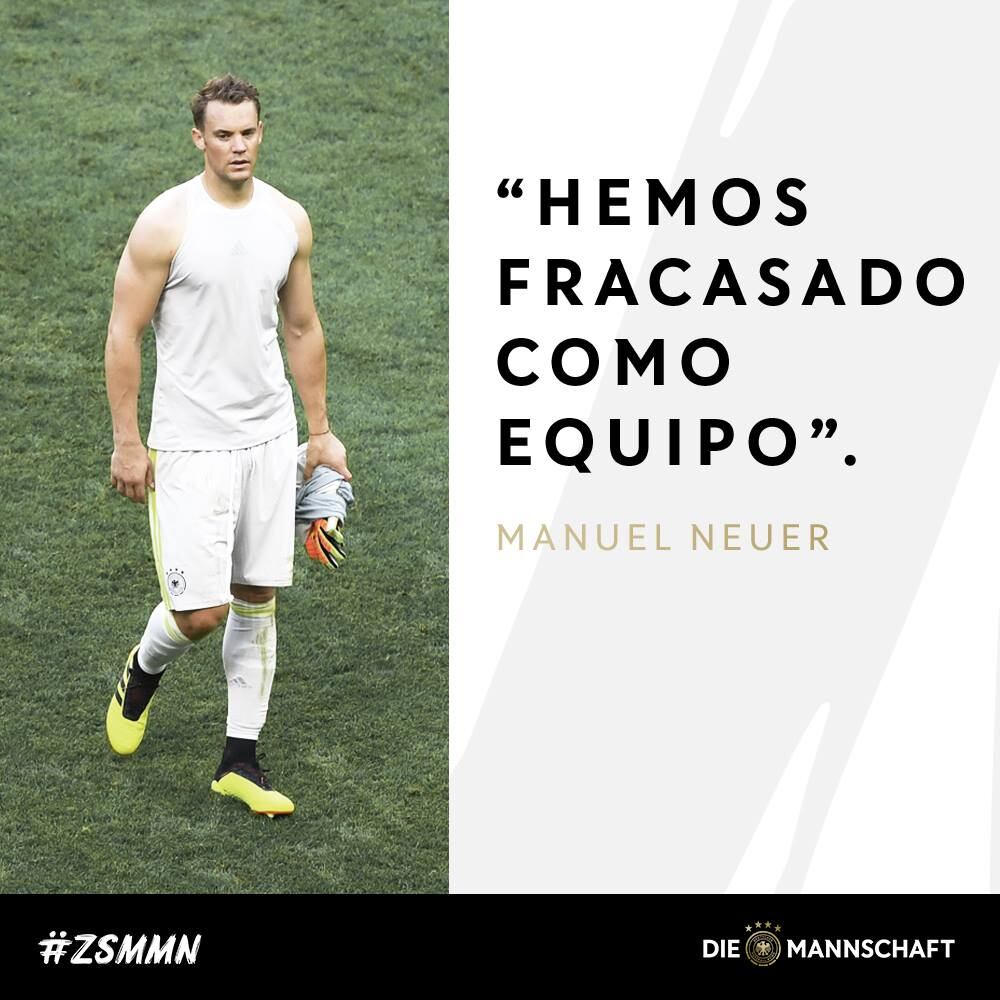 "La verdad merecimos quedar afuera, aunque sea duro decirlo. Su apoyo fue increíble, tanto en Alemania, en los estadios y en todo el mundo. En 2014 celebramos juntos, pero el fútbol es así. Debemos reconocer la derrota y aceptar que los rivales fueron mejores. ¡Volveremos fortalecidos, porque los campeones siempre se levantan", se lee en la red social.