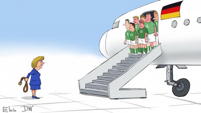 Sin embargo, otros como el caricaturista Sergey Elkin ,prefirió tomarse la eliminación con algo de humor e hizo una donde se ve a la canciller alemana Ángela Merkel al pie del avión que traía a los jugadores, con cara molesta y una faja en la mano, en referencia al castigo que les iba a dar por la eliminación, en una nación donde las mujeres son las que mandan.