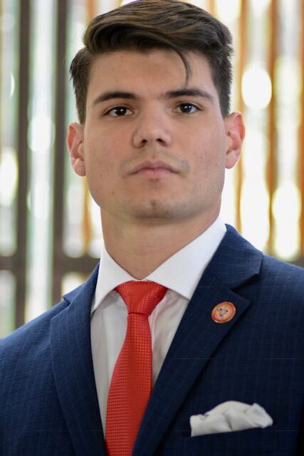 El bonito traje es color azul, mientras que la corbata es gris con líneas azules y rojo, en homenaje a nuestra bandera, esta fue elaborada en Barcelona, España.