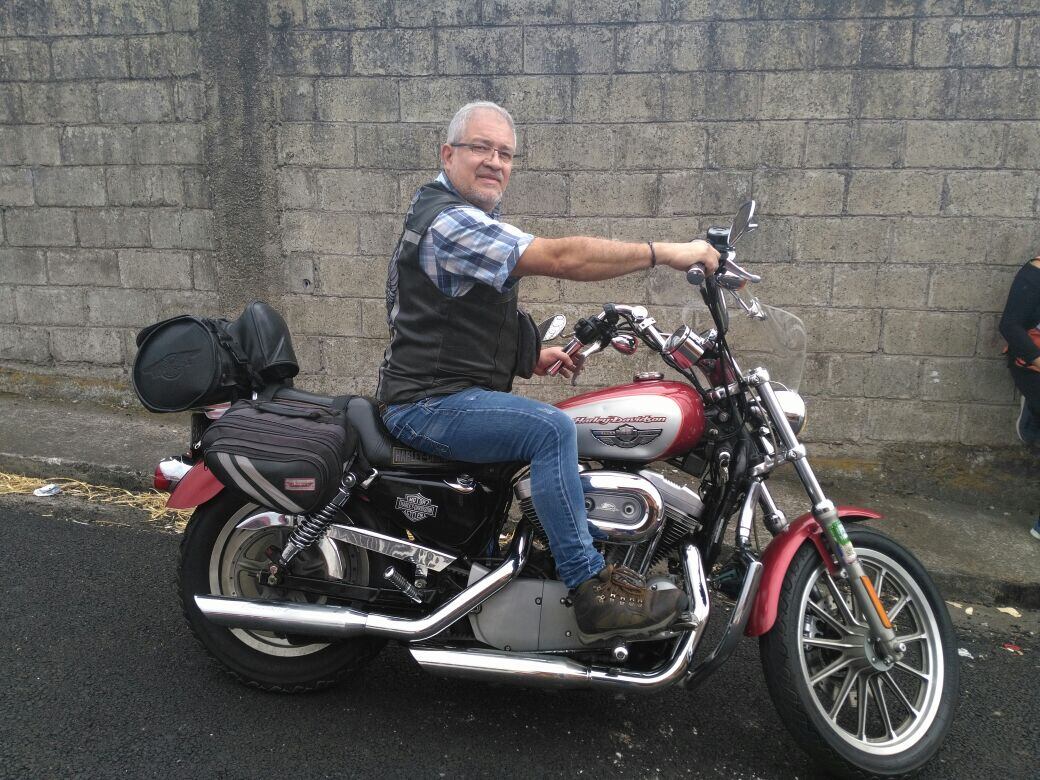 Hace como 5 años le dije a mi esposa, María Guadalupe Machado, que yo siempre había querido tener una moto Harley y que tenía que comprarla antes de que yo no pudiera subirme a ella, que no la pudiera manejar porque son 250 kilos de peso, ya con 60 o 70 años no lograría manejarla. Ajusté, saqué un préstamo y hace 4 años la compré en un lugar que se llama Moto Shopper en Alajuela.