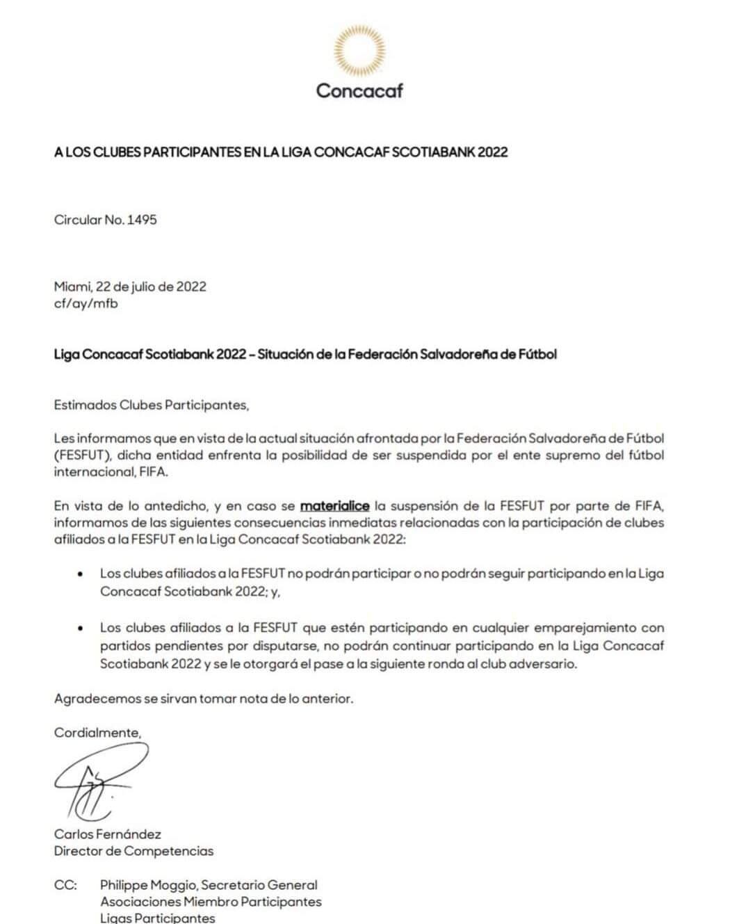 “Los clubes afiliados a la FESFUT no podrán participar o seguir participando en la Liga Concacaf Scotiabank 2022. Los clubes que estén en cualquier emparejamiento no podrán continuar de ninguna forma y se le otorgará el pase a la siguiente ronda al club adversario”, dice la carta.