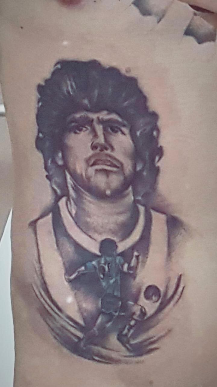 “El tatuaje me ocupa casi toda la costilla, lo tengo a Maradona y en la otra a Messi, son nuestros pilares en Argentina, lo mejor que tenemos a nivel de fútbol, son nuestros dioses del fútbol.