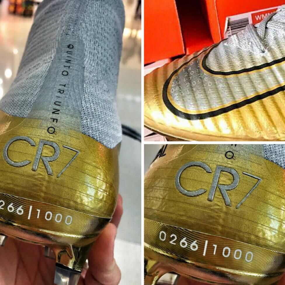 Los tacos serían una edición especial de los habituales Nike Mercurial Superfly V, se llamarían “Quinto Triunfo” (Special Edition), según se puede leer en la parte del talón del taco, que viene en color dorado y plateado de la mitad para arriba.