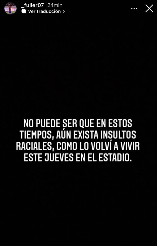 “No puede ser que en estos tiempos aún existan insultos raciales como los volví a vivir este jueves en el estadio”, escribió el jugador en una historia de su cuenta de Instagram.