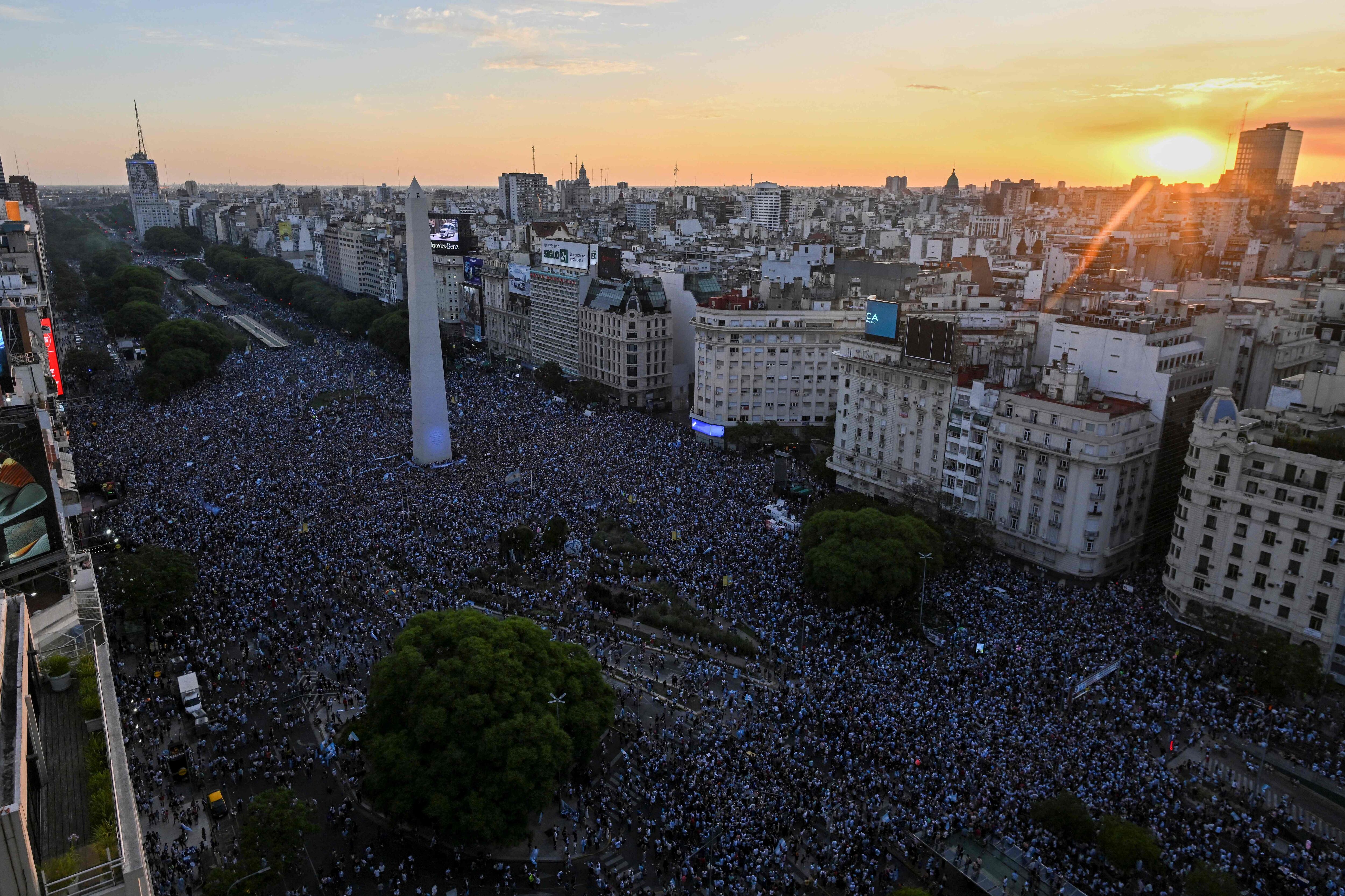 La euforia se transformó en multitudinaria manifestación que bajó como una marea desde los barrios hacia el centro de Buenos Aires. Llegaron al anochecer a pie, en autos, en vagones colmados del Subte (metro), en autobuses con gente colgada de los techos hasta rodear al tradicional Obelisco y armar un carnaval en la ancha Avenida 9 de Julio.