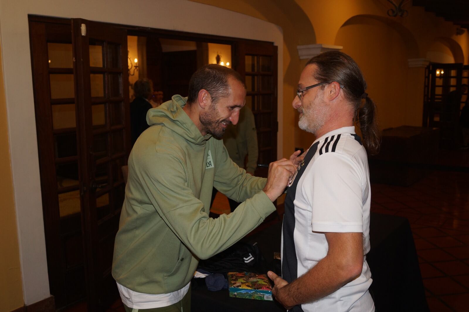 Luego del reconocimiento de la cancha del estadio Morera Soto este miércoles, el excapitán de la Juve y de la selección italiana campeona de la Eurocopa 2021, recibió a los fiebres por casi treinta minutos en el hotel Marriot en Belén.