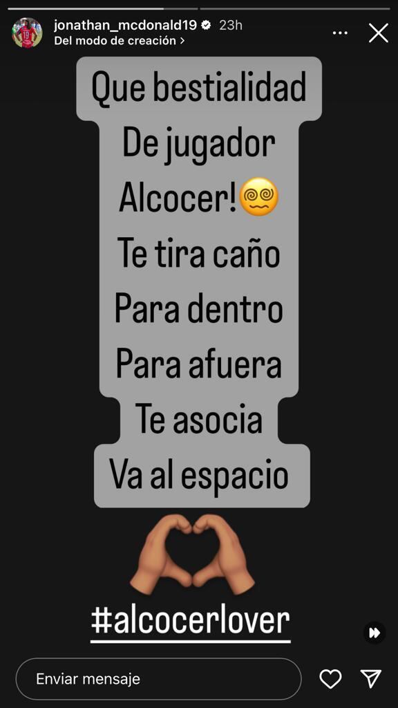 “Qué bestialidad de jugador Alcócer. Te tira caños para adentro, para afuera, te asocia, va al espacio. #AlcócerLover”, publicó el delantero de la Asociación Deportiva San Carlos.
