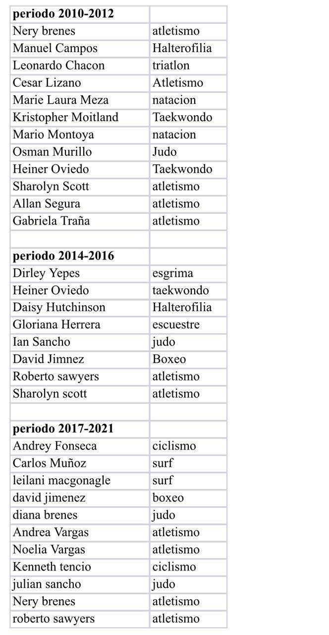 Yo le voy a enviar el listado de los atletas que tenían beca y que él diga cuál de esos no tenía proyección olímpica, que explique el por qué no (ver lista). En el periodo del 2010 al 2012 hay doce atletas, todos fueron a Londres 2012; en el periodo del 2014 al 2016 son ocho y fueron cuatro; en el 2017 al 2021 son once y seis fueron a Tokio. Ninguno es gente que no se la merezca.