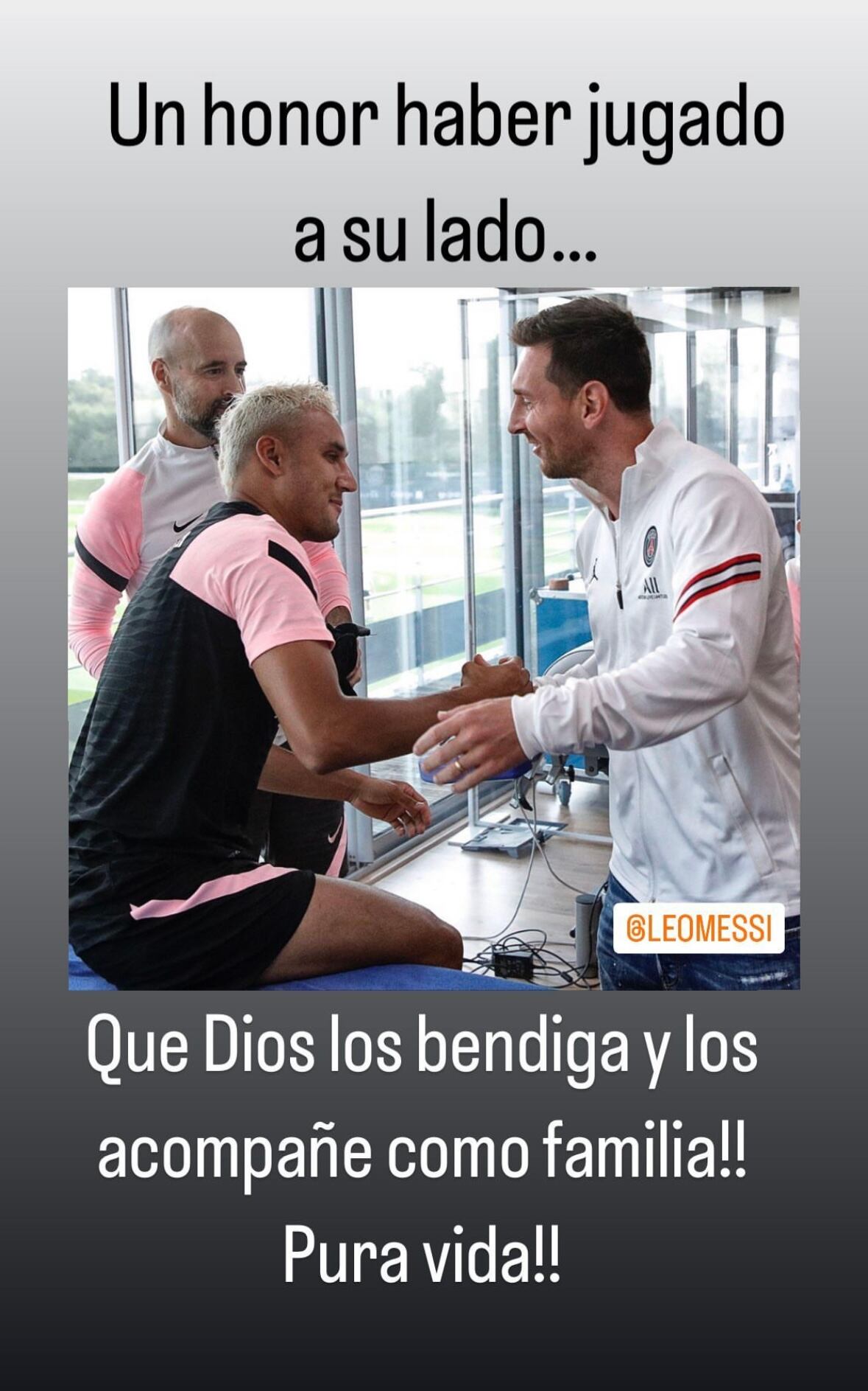 El guardameta tico, mediante sus historias de Instagram, compartió una foto junto a Leo Messi y escribió: “Un honor haber jugado a su lado. Que Dios te bendiga y los acompañe como familia. Pura Vida”.