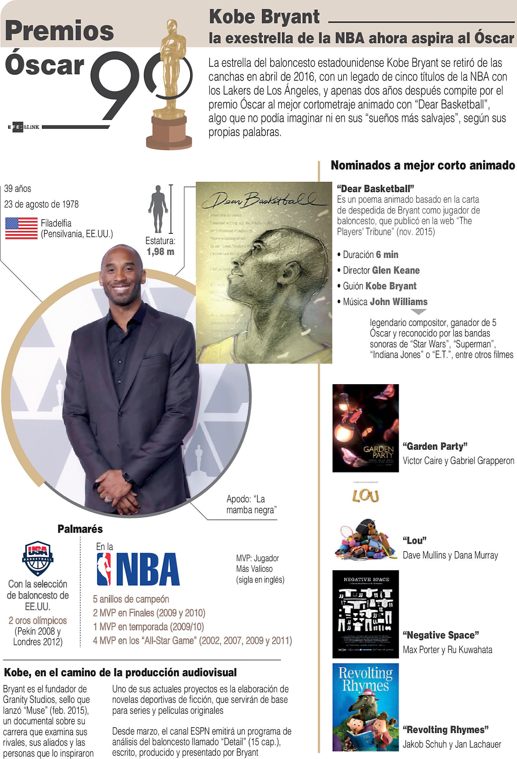 Lo que no esperaba la Mamba Negra es que sus sentimientos impresionarían a la Academia de las Artes y las Ciencias Cinematográficas de Estados Unidos al ver el corto animado “Querido Baloncesto”, un poema de seis minutos de duración basada en la carta del adiós de Kobe, nominado en la categoría “mejor corto animado”.