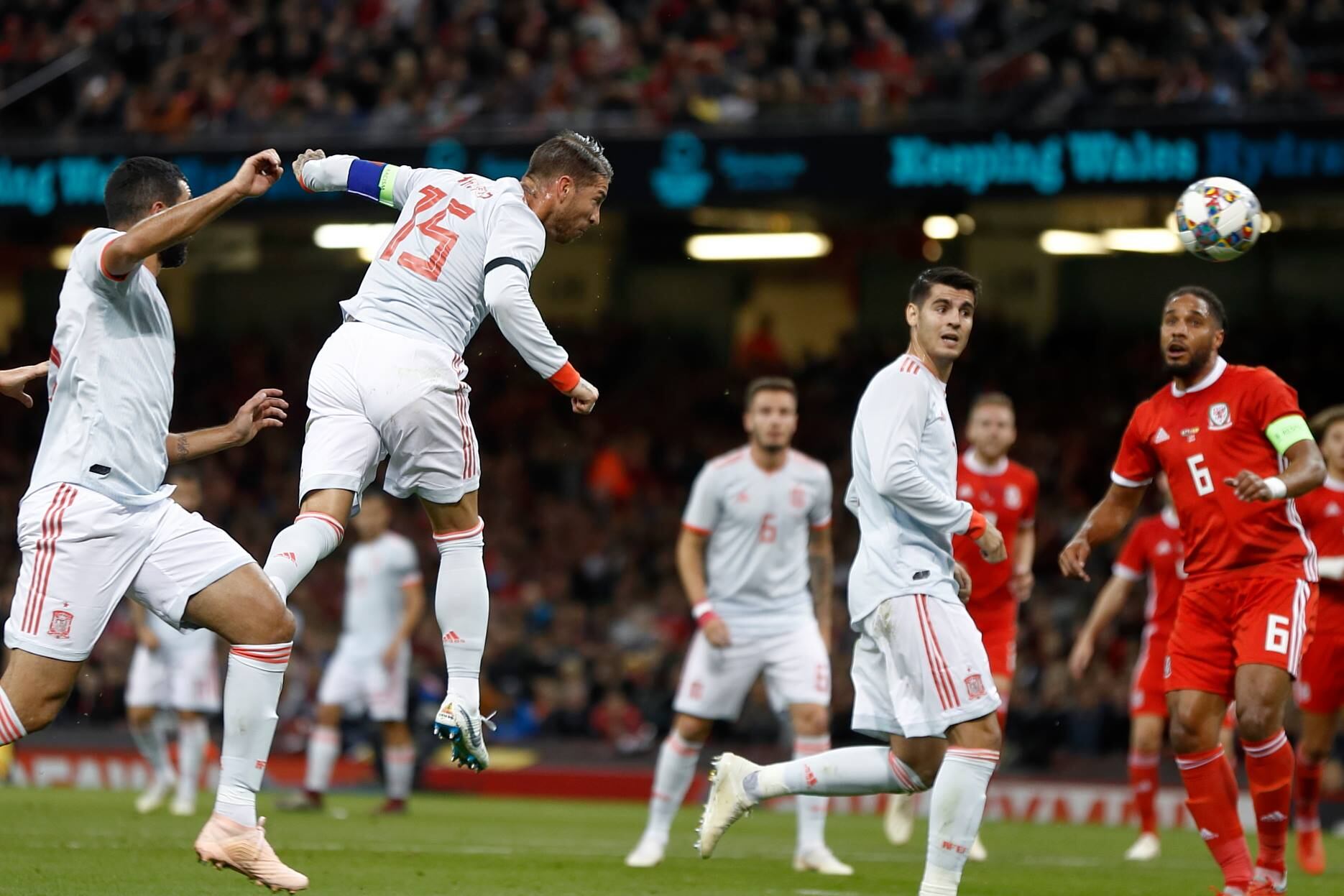 Paco Alcácer abrió el marcador (8), Sergio Ramos hizo el 2-0 de cabeza (19) y Alcácer repitió para poner el 3-0 (29), antes de que Marc Bartra hiciera el 4-0 (74). Sam Vokes hizo el gol del honor galés en el 89.