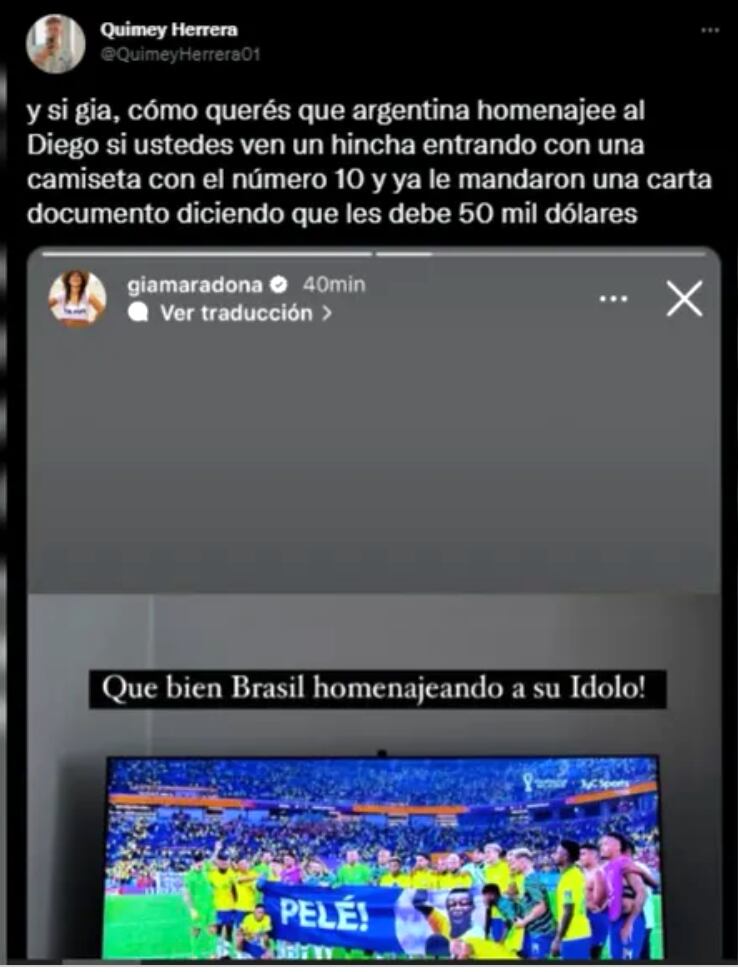 “Y si Gia, ¿cómo querés que la Argentina homenajee al Diego? Si ustedes ven un hincha entrando con una camiseta con el número 10 y ya le mandaron una carta documento diciendo que les debe 50 mil dólares”, fue una de las respuestas más virales. El usuario de Twitter @QuimeyHerrera01 tomó gran repercusión con sus duras palabras en alusión a la herencia y los derechos de la imagen del Diez, obtuvo más de 100 mil Me Gusta y cientos de respuestas acordes a esta postura.