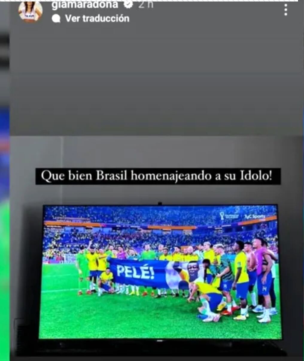 Pese a que solo podría tratarse de un gesto de la joven, en el que reivindicó a la selección brasileña por su actitud, su publicación tuvo una segunda interpretación por parte de los usuarios: Gianinna atravesaría un enojo puntual con el actual equipo argentino , que aún no rindió homenaje en la cancha a su padre. Si bien, desde la Confederación Sudamericana de Fútbol (Conmebol) realizaron un sentido evento llamado “Bajo la estrella del 10″ , el día en que se cumplieron dos años de su muerte - 25 de noviembre- , donde se recordó su gran incidencia en el fútbol mundial, la hija de Diego y Claudia Villafañe esperaría un gesto por parte de los jugadores de la Argentina.