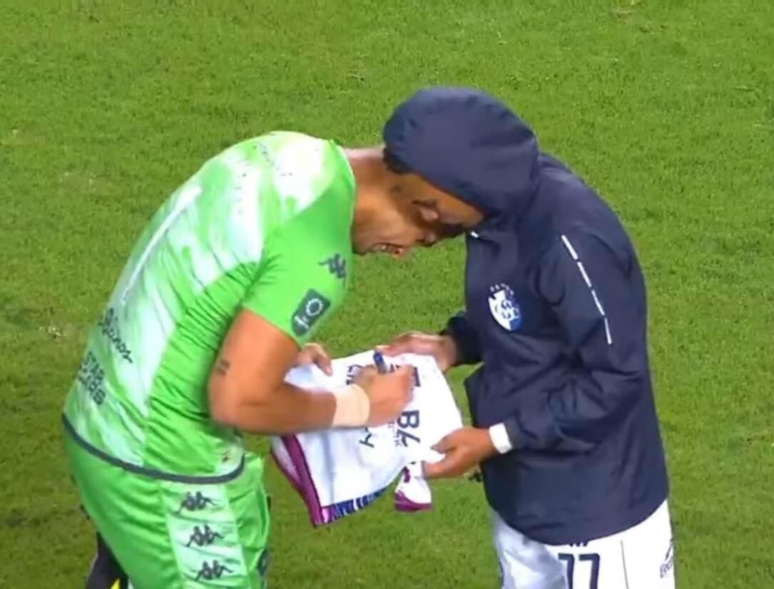 En la imagen sale el meta del Saprissa firmando una camiseta del Monstruo mientras que el atacante brumoso la sostiene y luego este último la mete en una bolsa de la jacket, se saludan y se van.