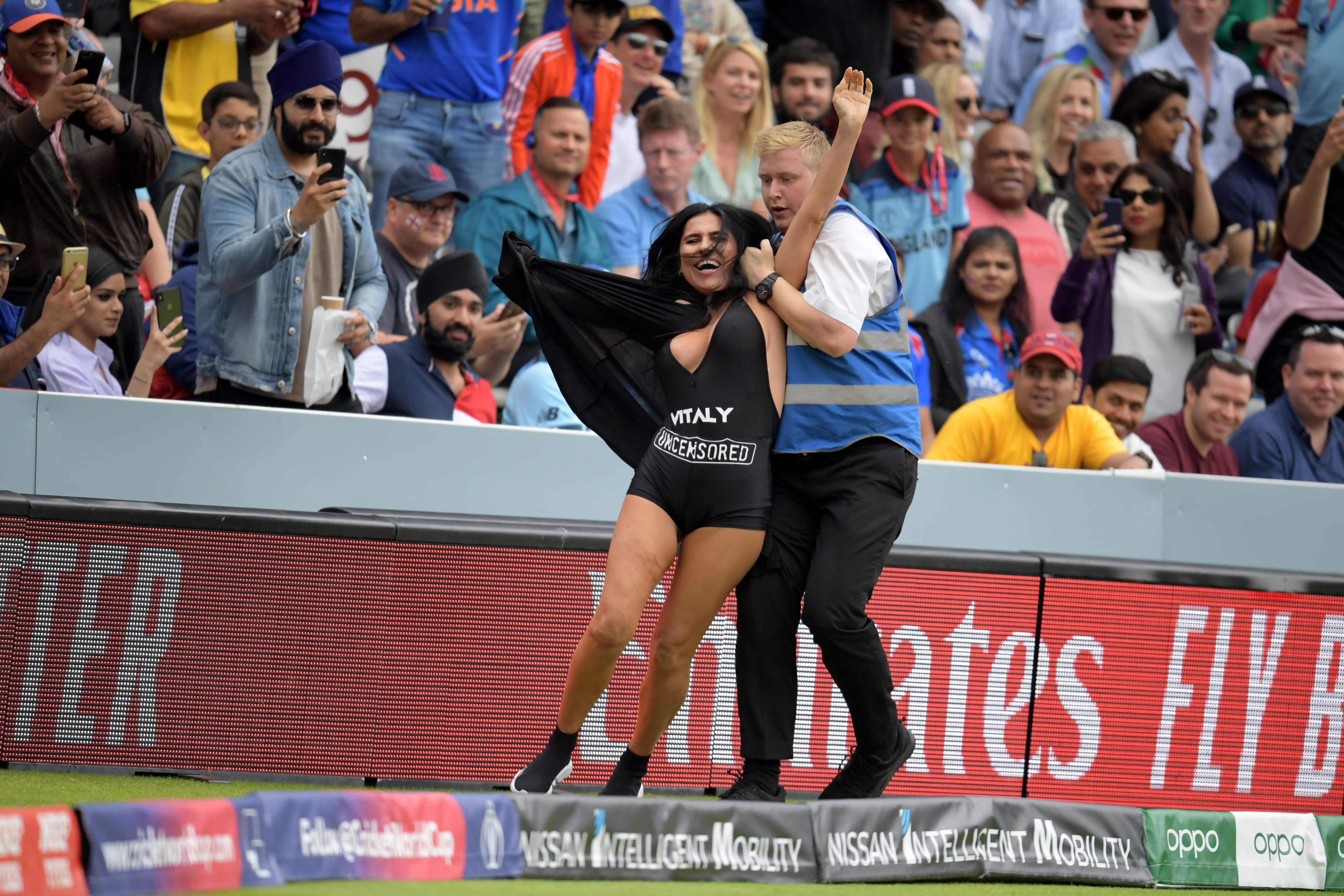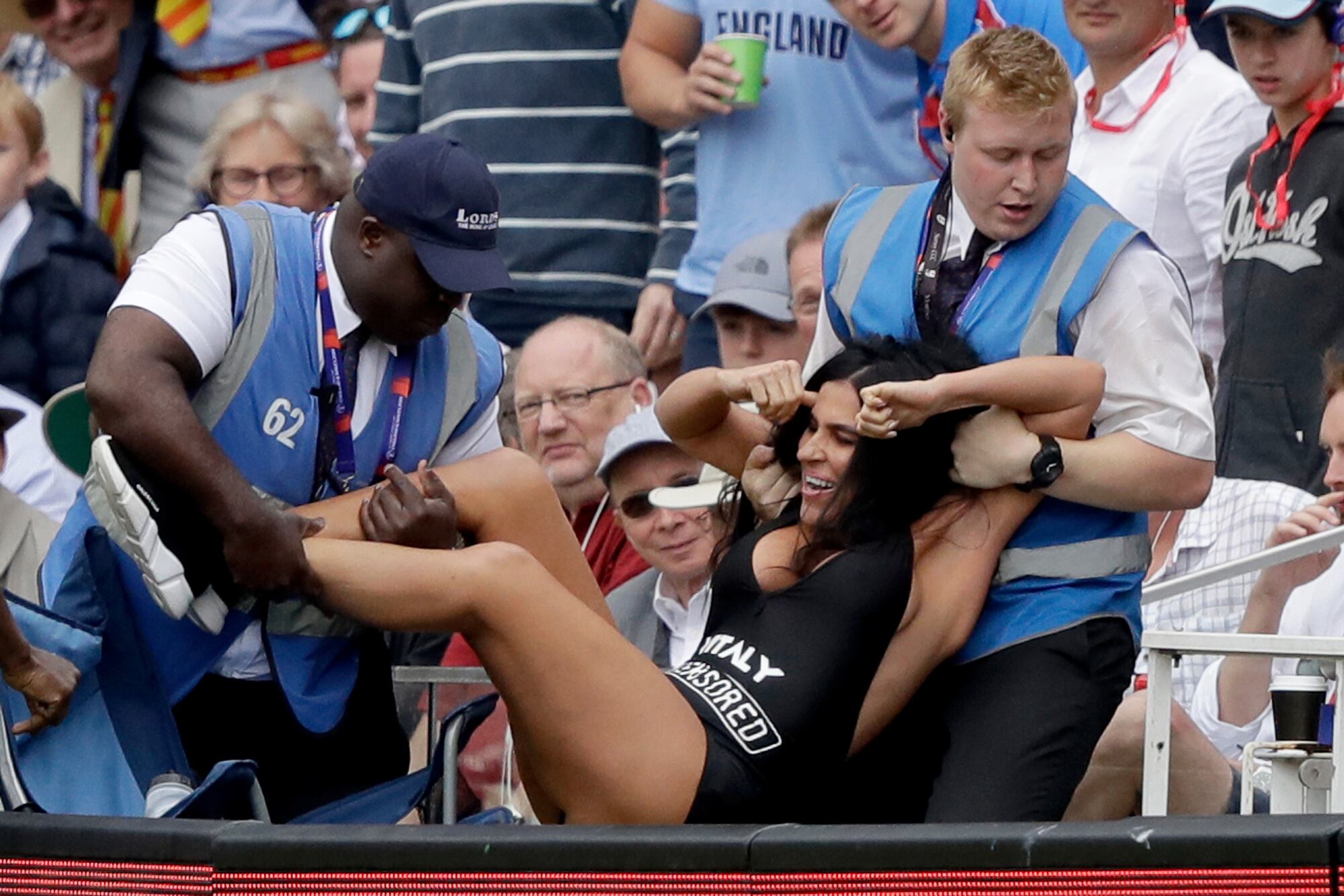 Elena Vulitsky se robó la atención del Lord’s Cricket Ground cuando pasó por encima de los carteles de publicidad y detuvo por unos minutos el duelo entre Inglaterra y Nueva Zelanda que define al campeón mundial de críquet.