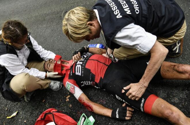 Y como las caídas no perdonan rangos y ambiciones, luego de sufrir, al tener que atravesar siete premios de montaña, tres de ellos de categoría especial, en la bajada, Richie Porte, quinto en la general individual, tomó mal una curva derrapando, llevándose por delante a Daniel Martin, ambos viajaban en el grupo del líder Froome que se salvó de milagro, lo mismo que el italiano Fabio Aru, y el colombiano Rigoberto Urán.