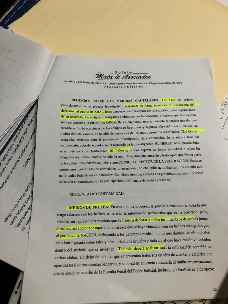“Se solicita suspender de forma inmediata la declaratoria del descenso del equipo Jicaral hasta tanto no se concluya el proceso de investigación, pues dependiendo de sus resultados, los equipos involucrados podrían perder la licencia que los habilita a pertenecer a la primera división, en cuyo caso se deberá dar una recalificación de los equipos en la primera y segunda fase del torneo.