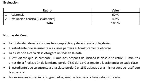- La modalidad de este curso es teórico-práctico y de asistencia obligatoria.