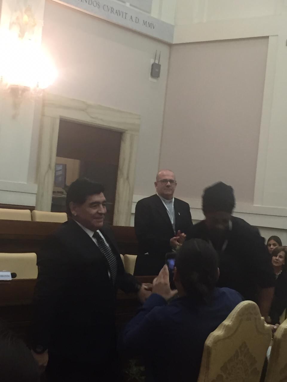 “Después de la audiencia nos trasladaron al estadio donde había dos grupos, uno con Sebastían ‘Brujita’ Verón y otro con Maradona, yo estaba en el camerino del estadio y en eso escuché un bullicio y era que venía Diego, entró al camerino me vio y me saludó.