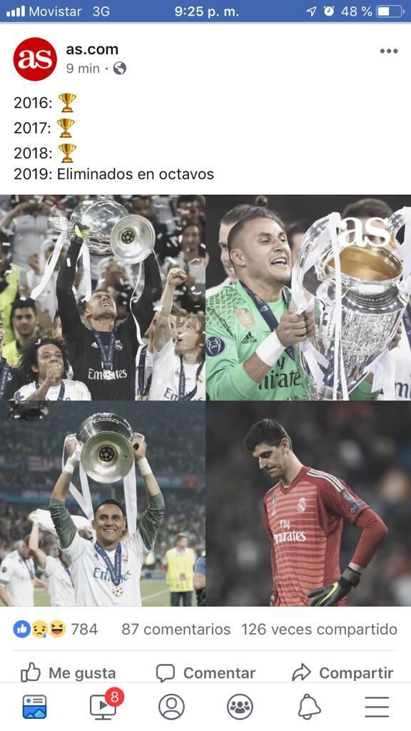 Por lo menos eso fue lo que dejó ver el Diario As de España. En su página de Facebook pusieron un meme con cuatro fotos, en tres de ellas sale Navas alzando las tres orejonas que ganó y en el último espacio aparece Courtois con la cabeza para abajo todo agüevado.