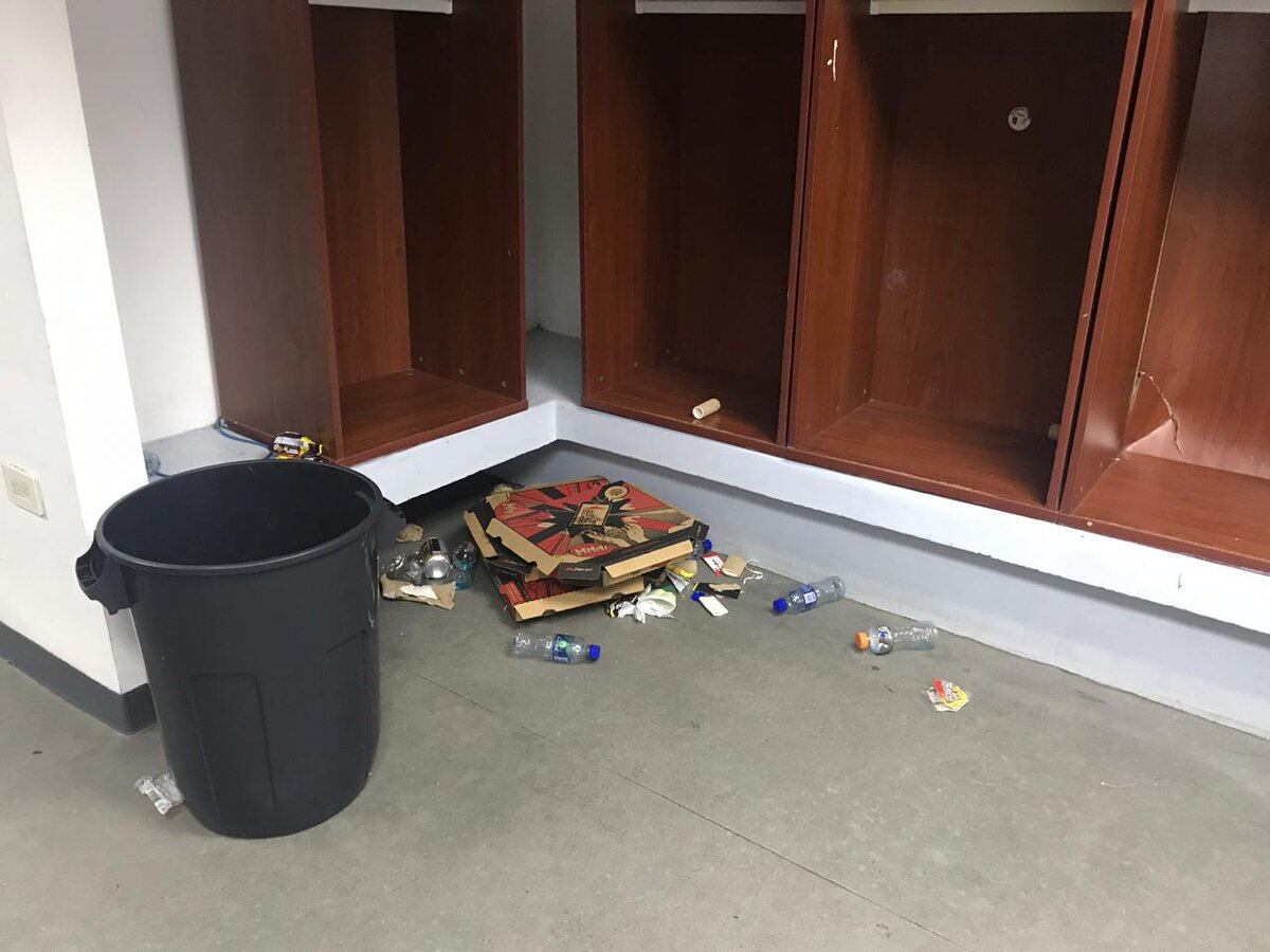 Los manudos dejaron tiradas en el piso del camerino cajas de pizza, envases de refrescos, servilletas y papeles, a pesar de que tenían un basurero a la par.