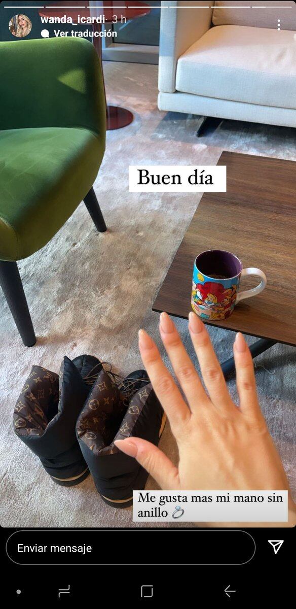 Nara publicó este lunes una historia en su cuenta de Instagram con una foto de su mano acompañada de un “Buen día. Me gusta más mi mano sin anillo”, haciendo referencia a la ausencia del anillo de matrimonio con el jugador argentino.