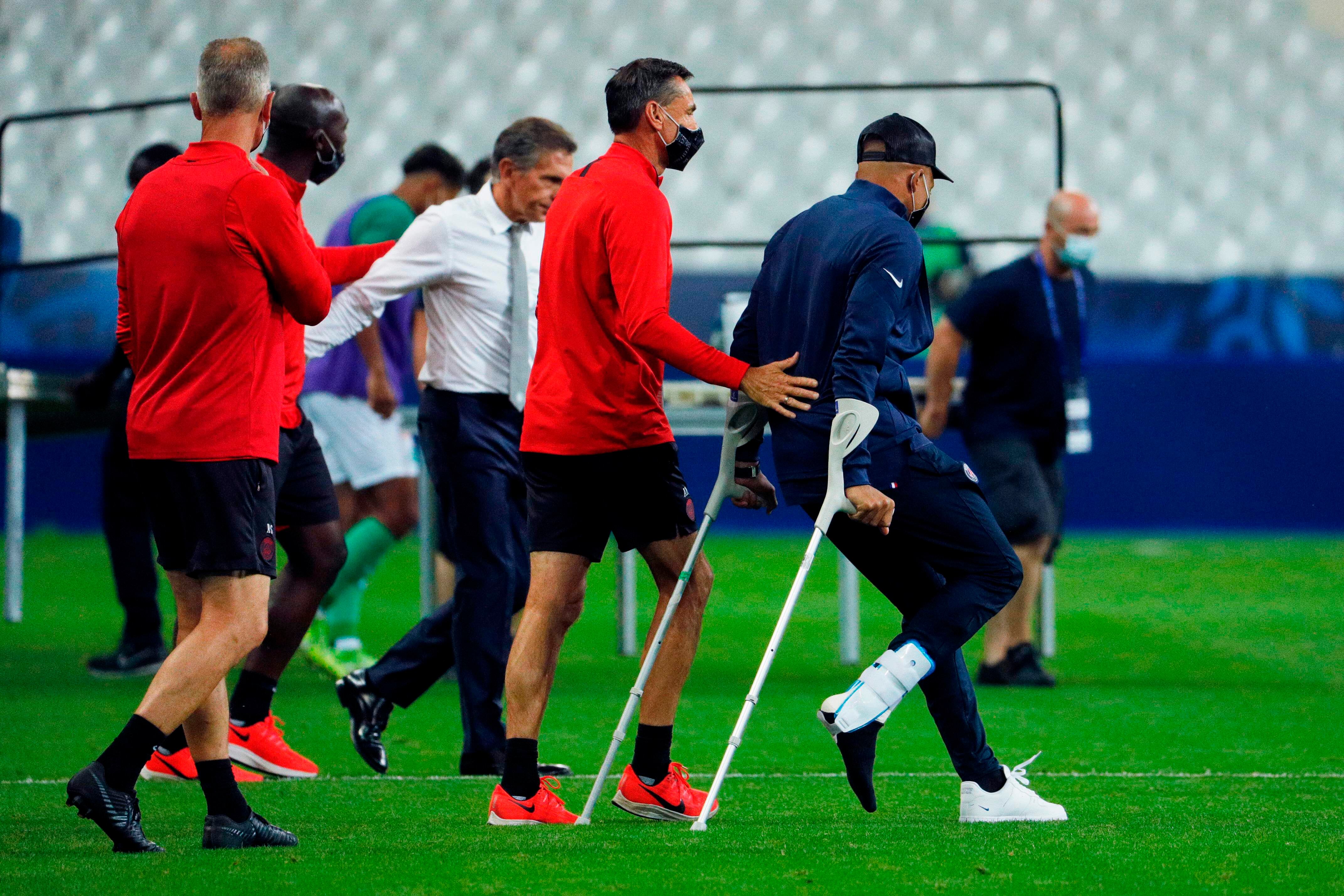 Tras marcharse a los vestuarios, Mbappé reapareció con muletas y una protección en el tobillo dañado, para celebrar la victoria en la Copa de Francia.