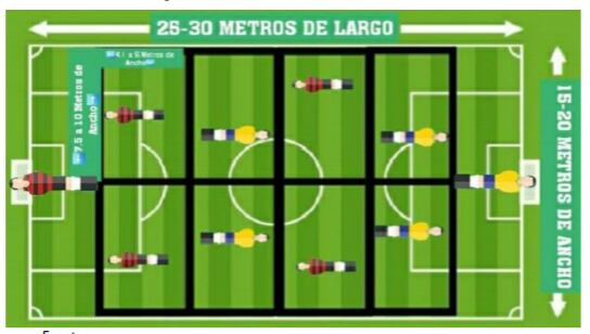 El juego consiste en que los participantes estén en distintos rectángulos de los cuales no pueden salirse y desde ahí o pasar la bola, o tirar a marco.