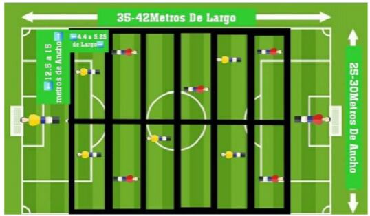 Cada marco será defendido por un portero, o sea, aquello es como un futbolín humano.