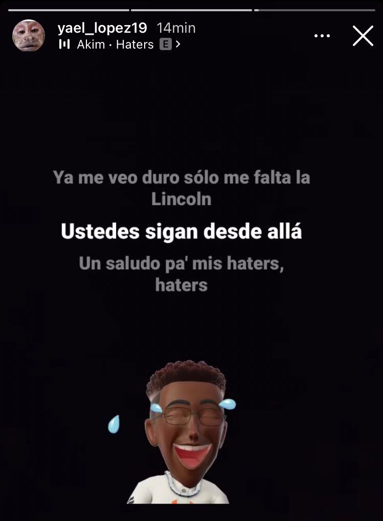 Yael puso un avatar de un dibujo similar a él que sale riéndose a carcajadas acompañado de la canción “Haters” del cantante panameño Akim y un extractor de la pieza que dice “ ustedes sigan desde allá, un saludo pa’ mis haters (quienes lo odian)”.
