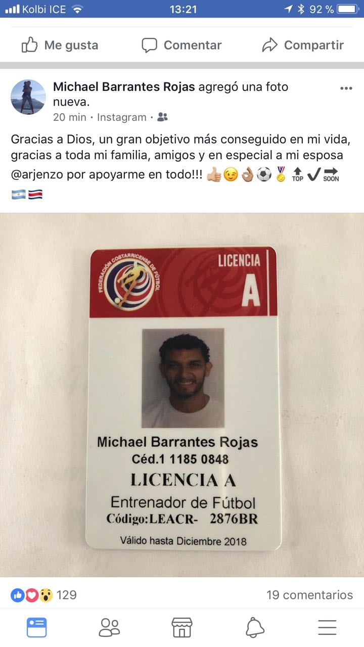 Mediante su cuenta de Facebook, el volante indicó que finalizó sus estudios como técnico y que ya tiene licencia en mano para en futuro tirarse a dirigir, o sea, le ganó a su propio técnico en conseguir este requisito.