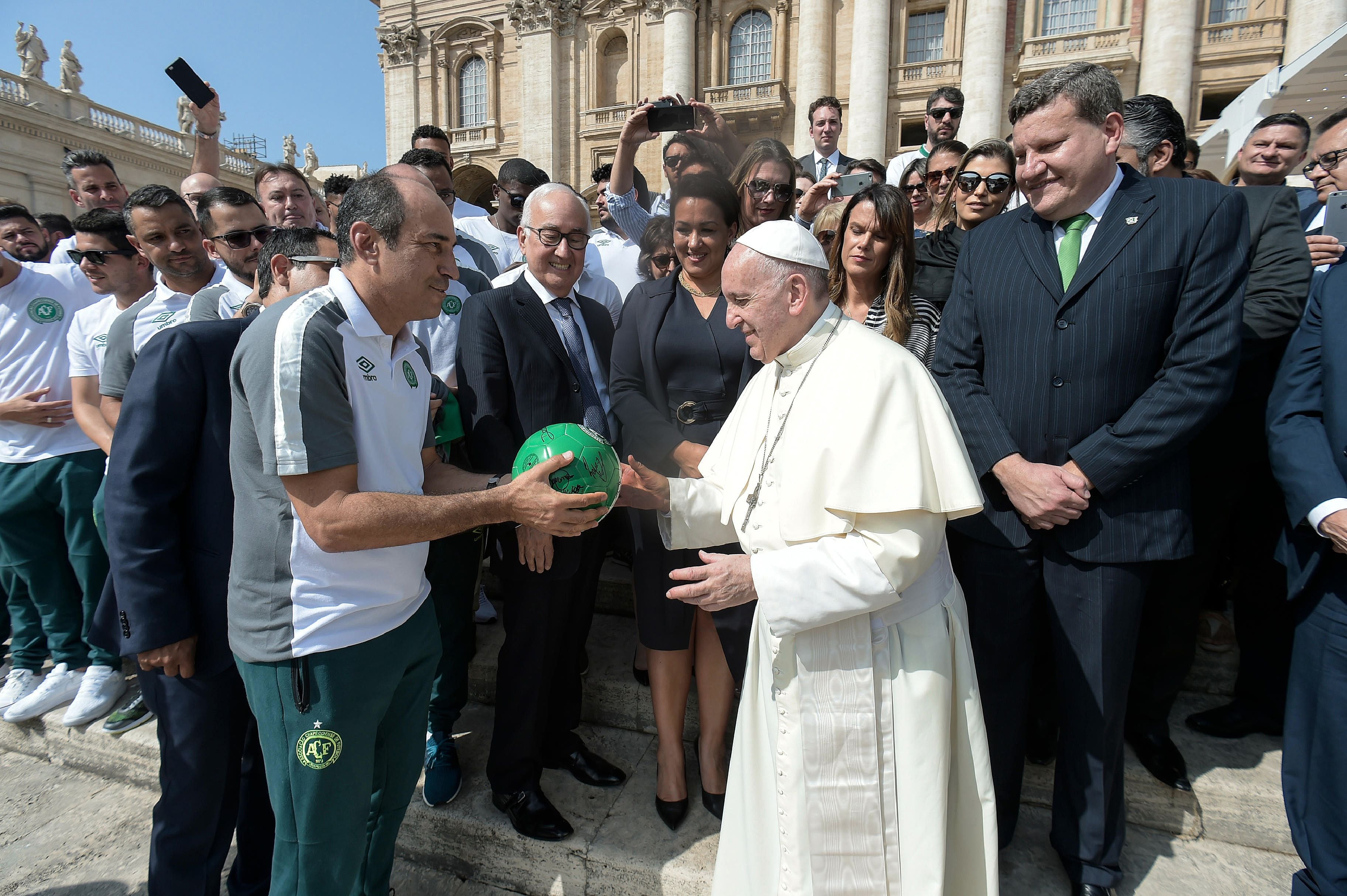 El pontífice argentino dio una bienvenida especial al Chapecoense en su audiencia general y posó para fotografías al final del acto semanal.