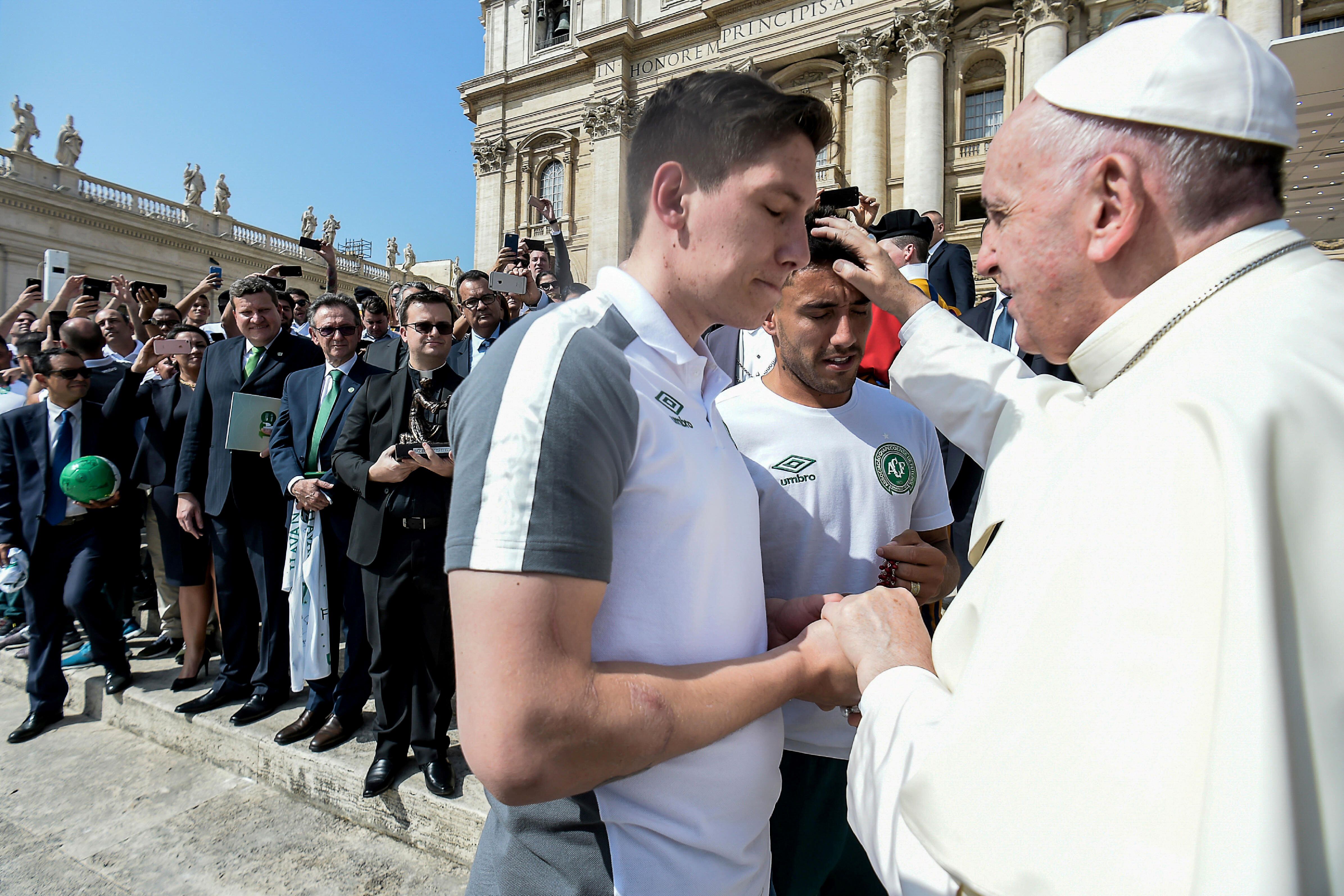 Tres futbolistas sobrevivieron al accidente y dos de ellos, Jackson Follmann y Alan Ruschel, asistieron al acto del Vaticano.