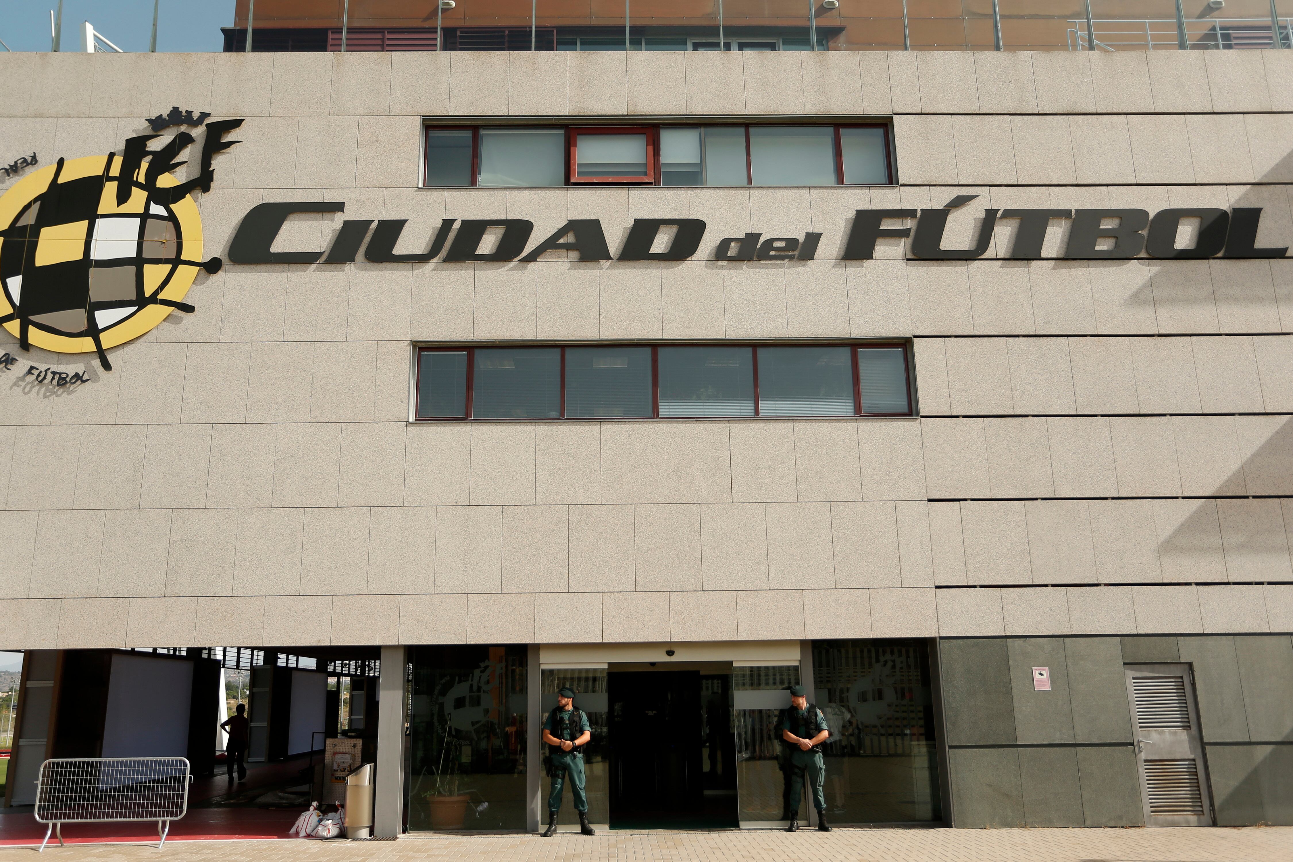 Frente a la Federación Española de Fútbol, dos guardias armados vigilaban la entrada mientras el personal entraba y salía de la instalación, ubicada cerca de la cancha donde se entrena la selección nacional de fútbol en Las Rozas, en las afueras de Madrid.