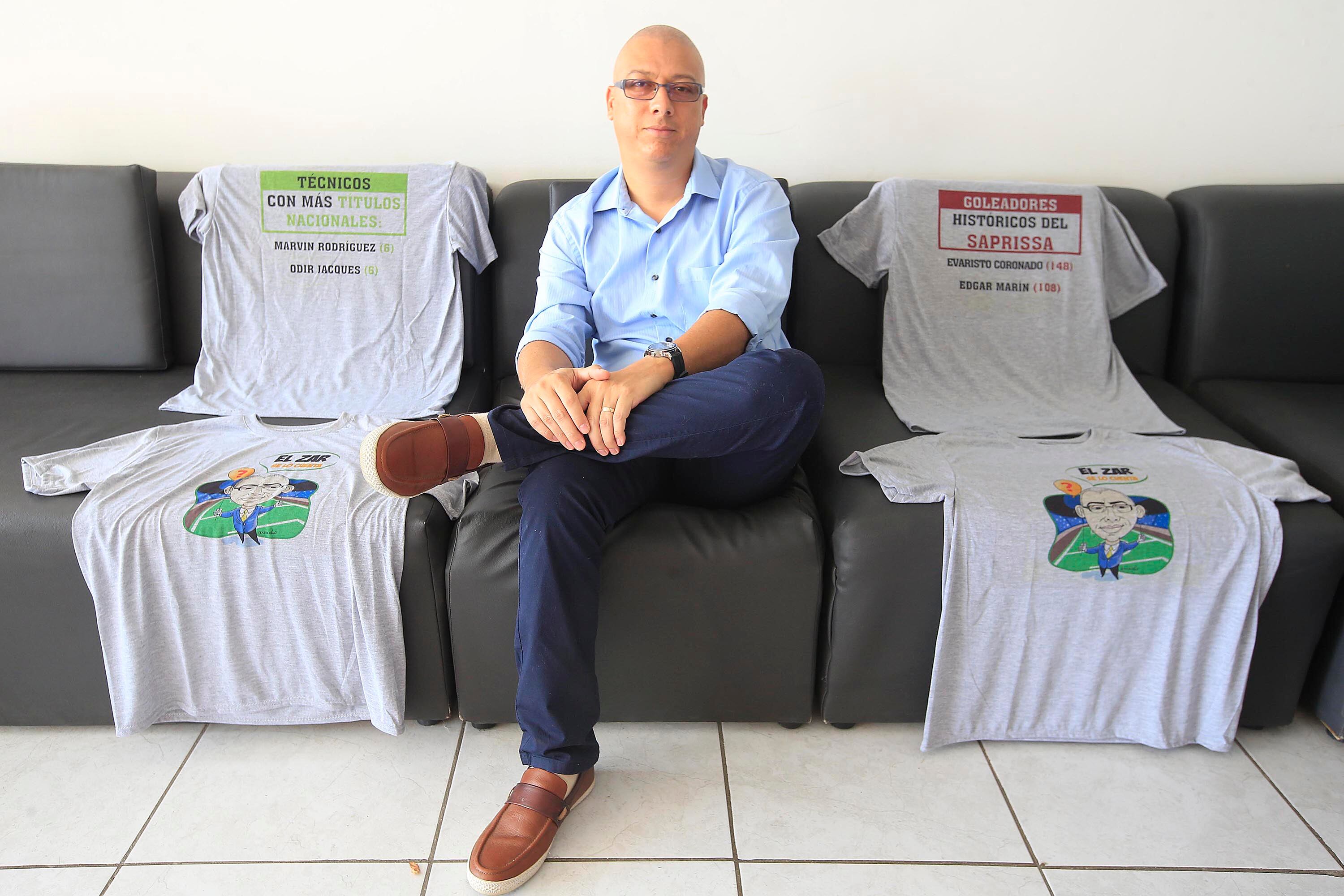 Imprimir en camisetas o jarras datos históricos del fútbol nacional, de clubes, de la selección nacional o hasta un jugador en particular y venderlas al público es la idea a la que le está sacando brillo junto a su esposa y que promueve en sus concurridas páginas de redes sociales.