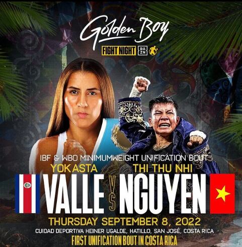 La boxeadora nacional, Yokasta Valle, peleará por la unificación de los títulos del peso mínimo contra la vietnamita Nguyen Thi Thu Nhi. El encuentro será el 8 de setiembre, a las 9:00 de la noche, en una velada boxística que se realizará en Hatillo.