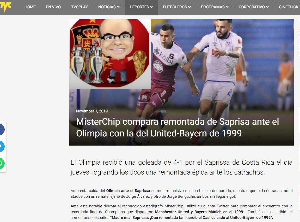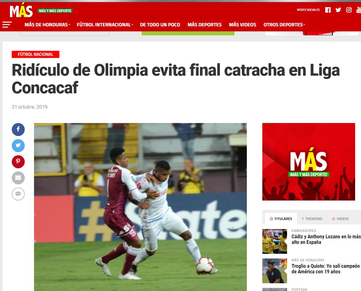 “Olimpia sufrió e hizo el ridículo al caer 4-1 frente al Saprissa y desperdiciar una ventaja de dos goles y dejó a los hondureños con la frustración de ver una final hondureña en la Liga Concacaf”, indicó el diario Deportivo Más.