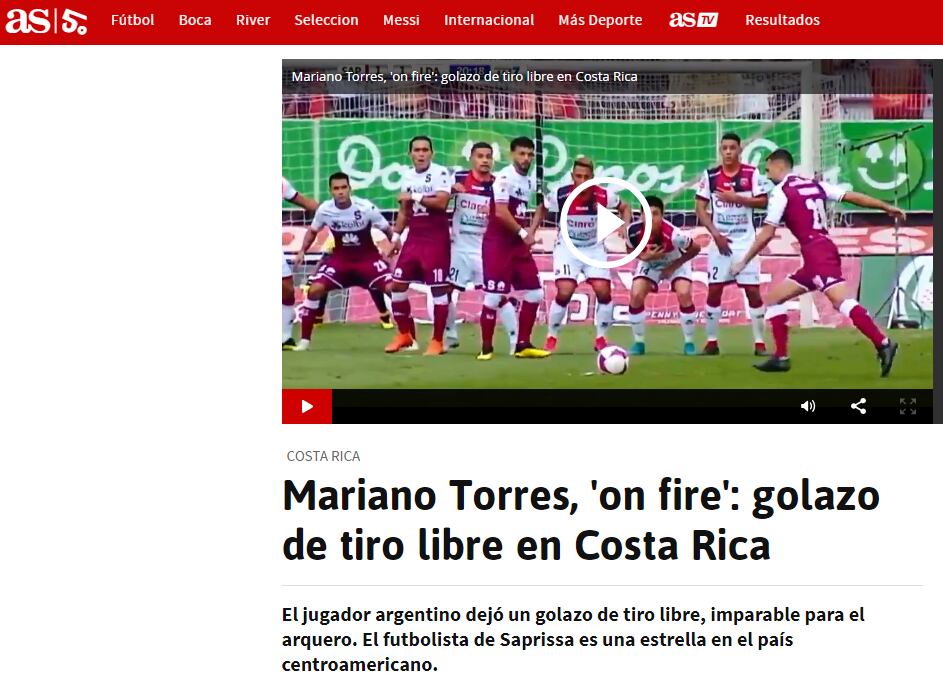 En la nota detallaron: “El espectacular tiro libre de Mariano Torres para Saprissa. El ex Boca le ganó el clásico a Alajuelense por 2 a 1 y su gol fue clave”, esto para destacar la grabación del tiro libre.