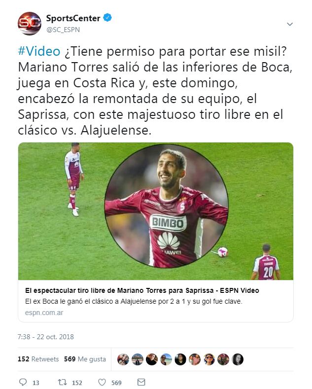 “¿Tiene permiso para portar este misil? Mariano Torres salió de las inferiores de Boca, juega en Costa Rica y, este domingo, encabezó la remontada de su equipo, el Saprissa, con este majestuoso tiro libre en el clásico vs. Alajuelense”, escribieron en Twitter, donde compartieron el video del golazo.