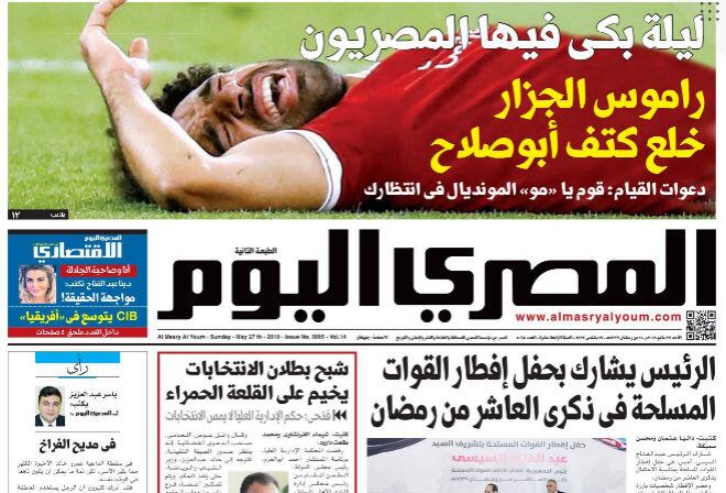 La portada del periódico Al Masry al Youm publica una foto de Salah tumbado en el suelo con gestos de dolor y titula: "Una noche en la que los egipcios lloraron, Ramos, el carnicero, dislocó el hombro de Abu Salah".