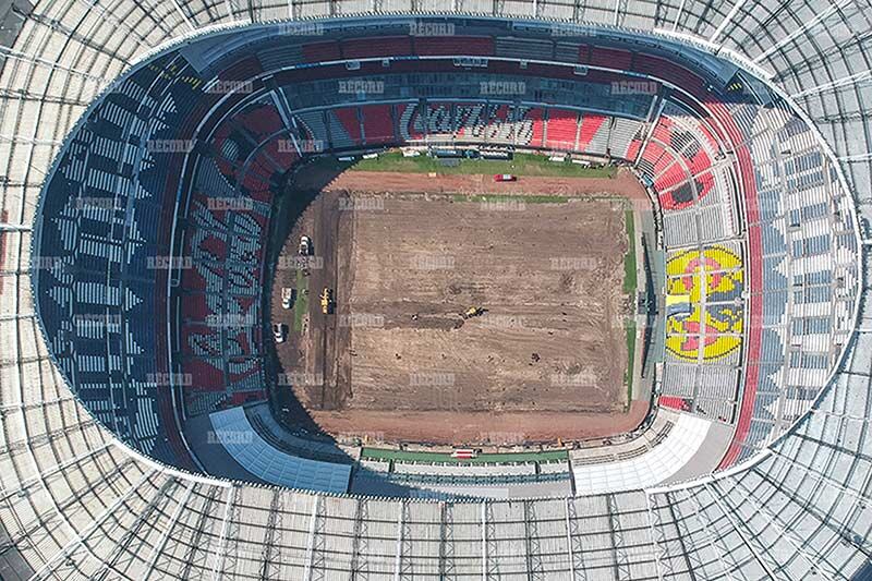 El Diario deportivo Récord de México compartió este miércoles una imagen de la cancha del estadio Azteca, donde se ve que quitaron el pasto híbrido para poner uno nuevo.