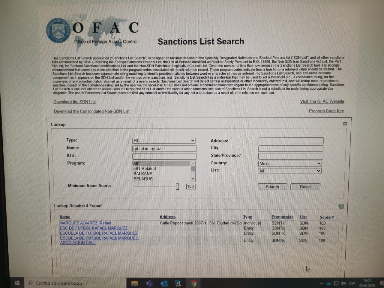 Su nombre quedó en la lista negra de la Oficina de Control de Activos Extranjeros de EE. UU. (OFAC, por sus siglas en inglés) en la que hasta este lunes todavía forma parte según se puede ver en la página web del departamento del tesoro gringo.