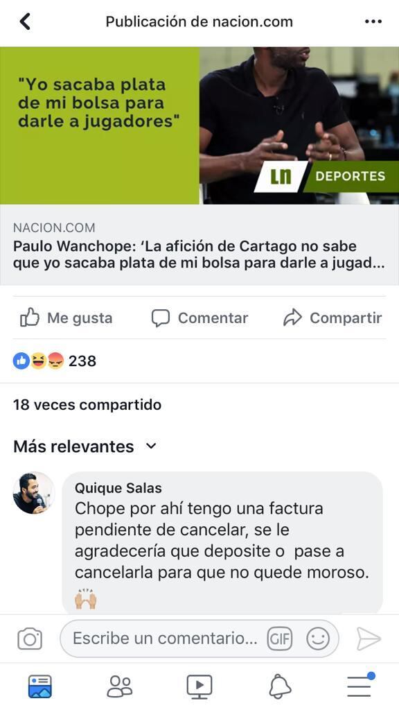En una publicación del diario La Nación donde Chope dijo: “la afición de Cartago no sabe que yo sacaba plata de mi bolsa para darle a los jugadores”, las reacciones no se hicieron esperar y hasta los empresarios brumosos le sacaron facturas pendientes.