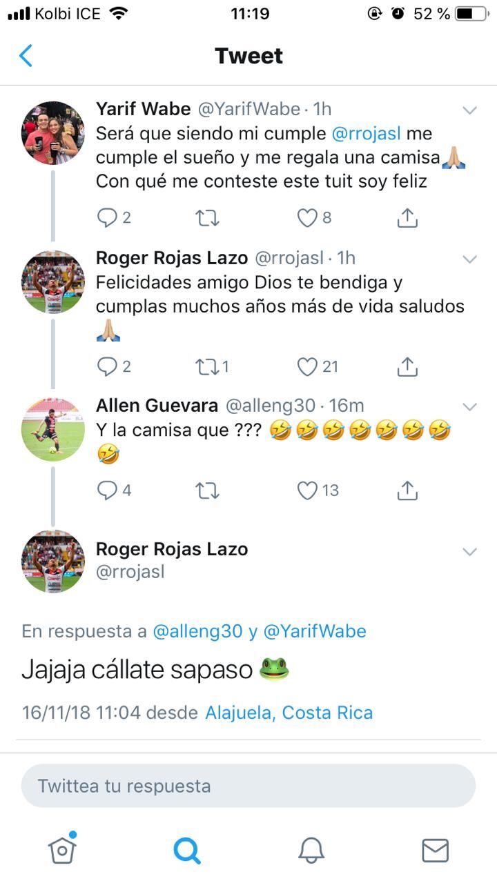 Ro-Ro, nada tonto, le respondió al muchacho para sorprenderlo deseándole un feliz cumpleaños, pero se hizo el loco con lo de la chema, por lo que, de inmediato se metió Allen Guevara y le puso a su compa, para pegarle color: “¿Y la camisa qué?”, con varias caritas llorando de la risa y Rojas le contestó: “jajajaja cállate sapazo”.
