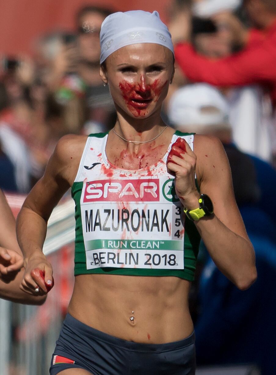 a mitad de la carrera, Mazuronak sufrió una hemorragia nasal. Una complicación inesperada y que, en cuestión de segundos, le cubrió todo el rostro de sangre. Al notar lo que le pasaba, Volha se limpió como pudo la cara con un pañuelo y hasta improvisó un pequeño tapón para poder seguir corriendo.