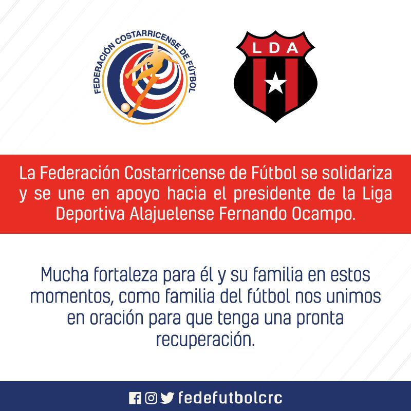 Por su parte, en la Federación Costarricense de Fútbol destacaron que la familia del fútbol nacional debe estar unida para dar apoyo en momentos como estos con una postal publicada en sus redes sociales.